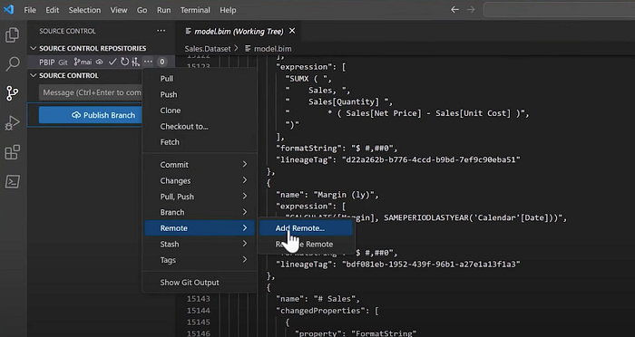 From now on, because you have a Git Enabled folder, you can track and version control any change you make in desktop, for example, if you change a measure, you can easily track that change in Git. Visual Studio Code will show you that you have a file div in your model div file.